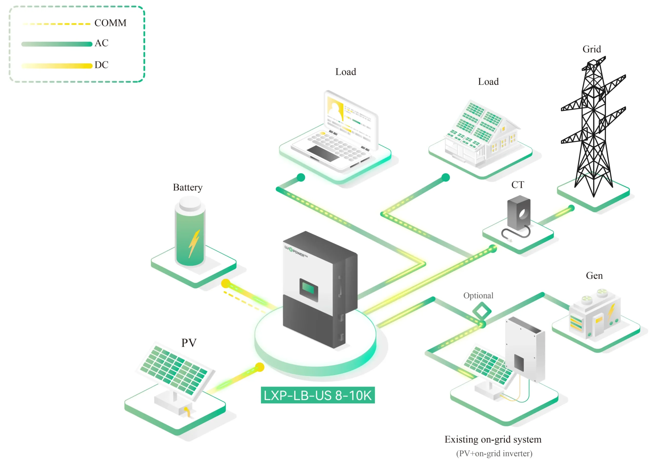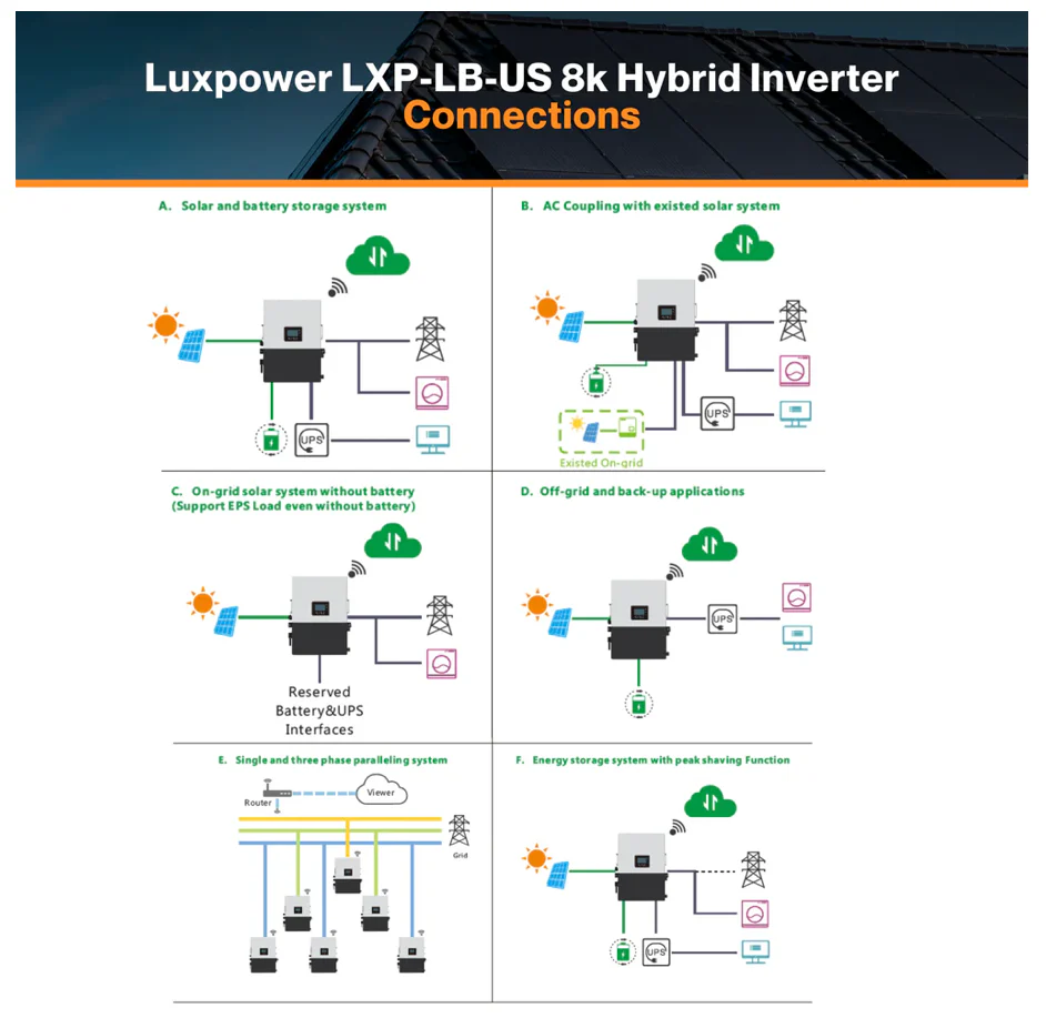 La serie de inversores de almacenamiento de energía LXP-LB-US 5-10K es adecuada para sistemas de almacenamiento de energía fotovoltaica con red de fase dividida.